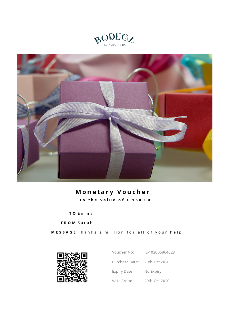 Get a beautifully formatted Gift Voucher, ready to print. We’ll also email you a backup.